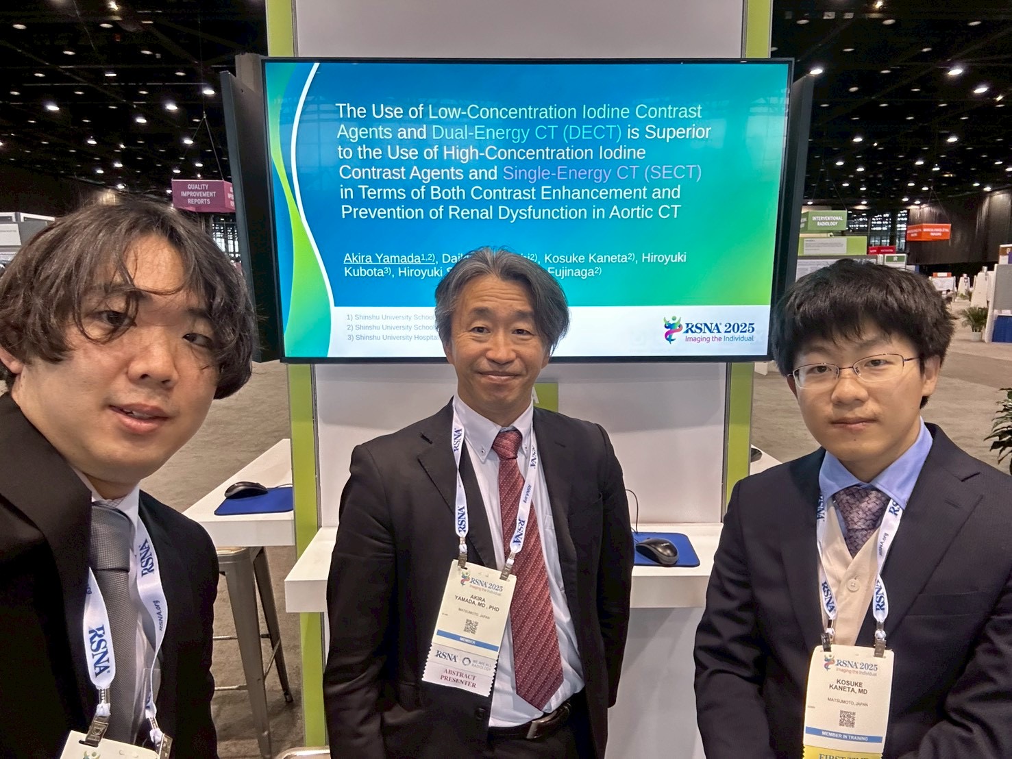 当教室からは、山田哲教授、後期研修医の金田康資先生、小林大輝(筆者)が参加しました。山田哲教授は、「The Use of Low-Concentration Iodine Contrast Agents and Dual-Energy CT(DECT)is Superior to the Use of High-Concentration Iodine Contrast Agents and Single-Energy CT(SECT)in Terms of Both Contrast Enhancement and Prevention of Renal Dysfunction in Aortic CT」という演題でポスター発表を行いました。