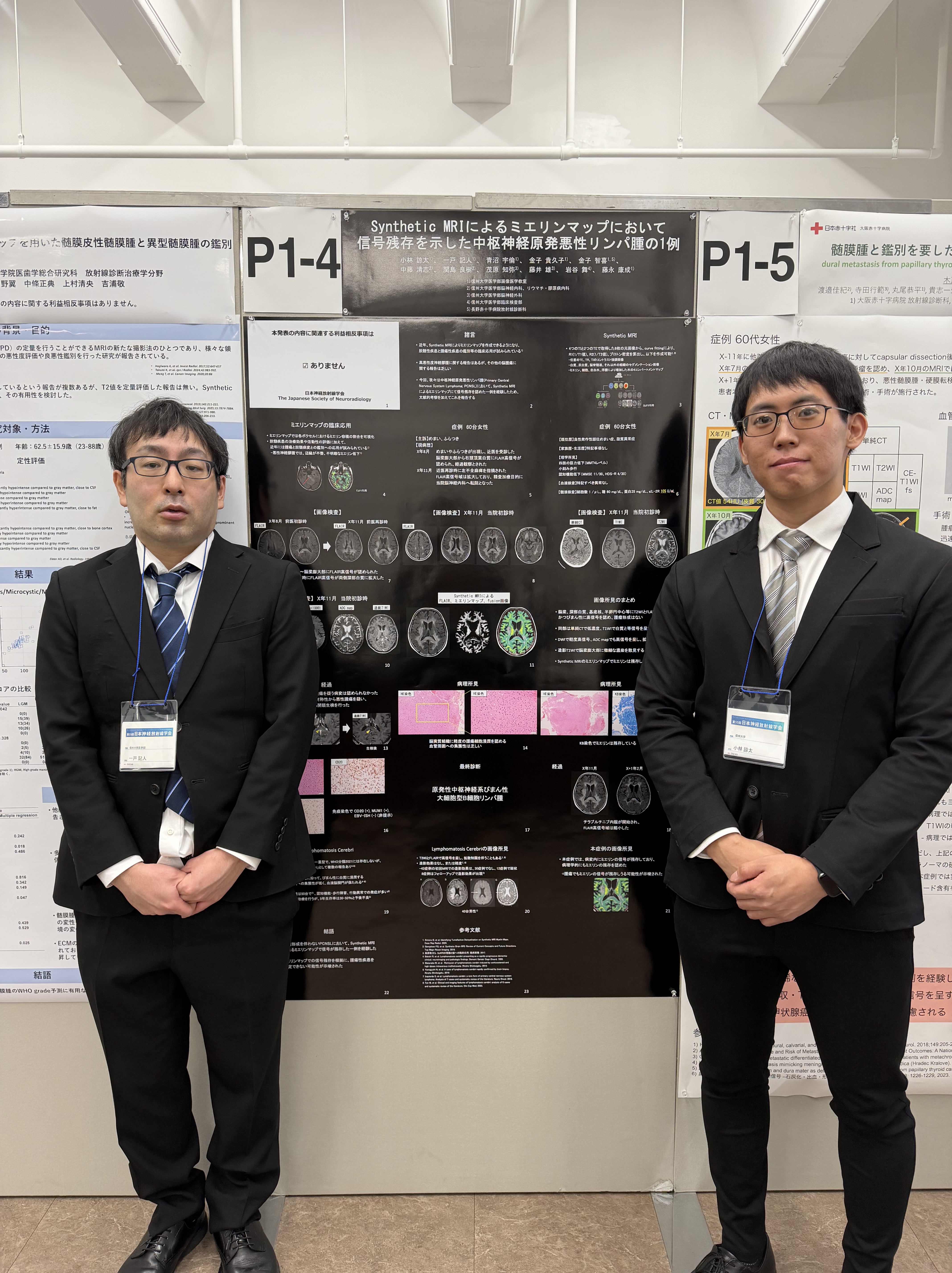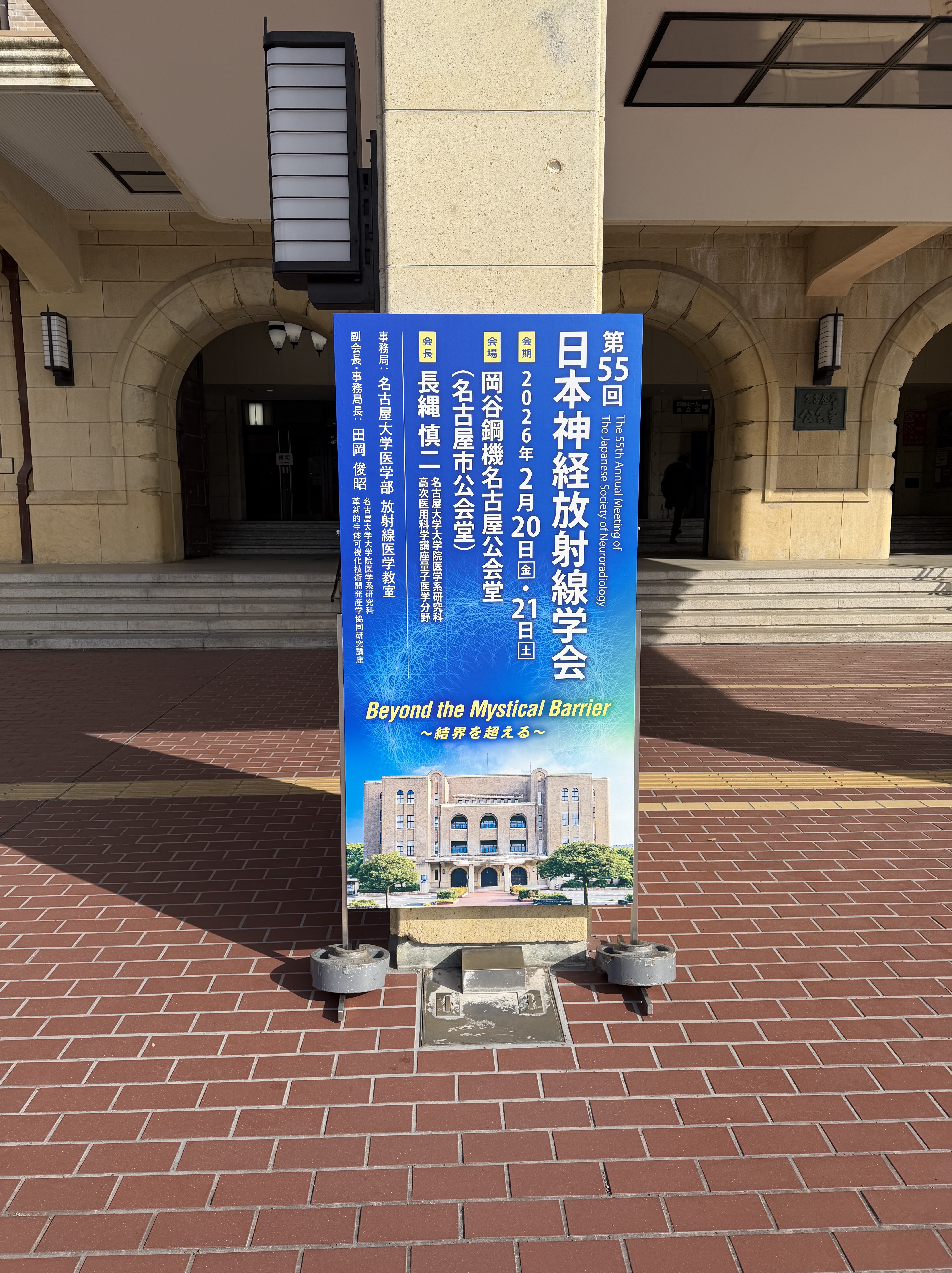 2026年2月20-21日に愛知県名古屋市の岡谷鋼機名古屋公会堂にて、第55回日本神経放射線学会が開催されました。当教室から私(小林〈諒〉)が共同演者の一戸先生のご指導のもと、「Synthetic MRIによるミエリンマップにおいて信号残存を示した中枢神経原発悪性リンパ腫の1例」のポスター発表を行いました。Synthetic MRIを用いたミエリンマップの作成が可能になり、近年様々な臨床応用が試みられています。今回、腫瘤形成を伴わない中枢神経原発悪性リンパ腫でミエリンの残存を認めた1例を経験し、文献的考察を加えこれを発表しました。1つの症例をじっくりと読影し、また発表にあたってMRIの原理からしっかりと学ぶことができ、大変有意義な機会となりました。学会では教育講演やシンポジウムを主に拝聴し、基本的な事項から最先端の研究まで多種多様に学ぶことができました。(文責:小林〈諒〉)