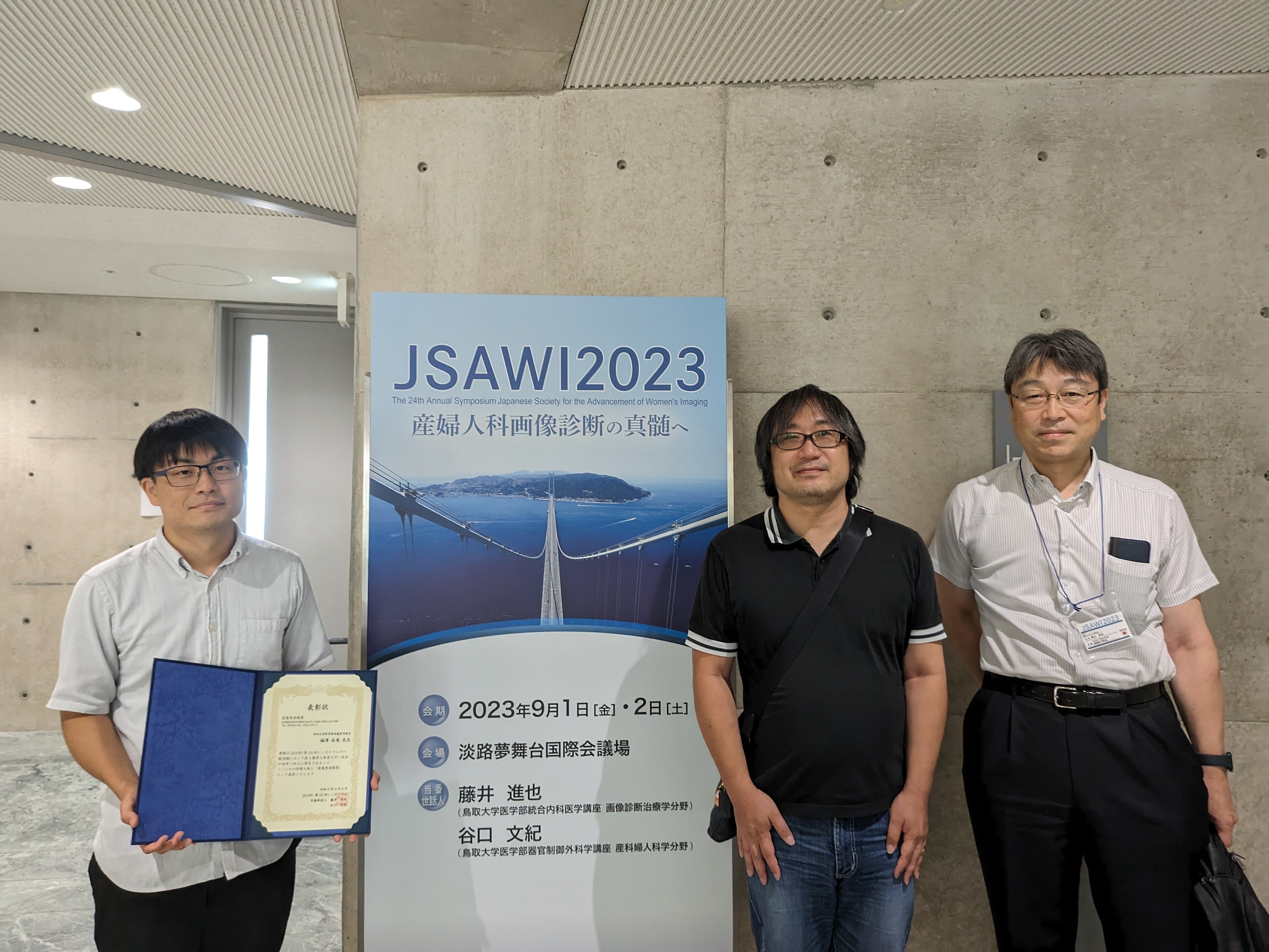 令和5年9月1日〜9月2日に、淡路島夢舞台国際会議場にて、Japanese Society for the Advancement of Women’s Imaging(JSAWI)の第24回シンポジウムが開催されました。JSAWIは、産婦人科関連疾患の画像に高い関心・技術をもった産婦人科医・放射線科医・病理医が一同に会して行われるシンポジウムです。最先端の内容を取り扱った講演や熱量のあふれるディスカッションは聞いているだけでも深い知識と理解を得ることができました。また、会場の美しさが素晴らしかったです。